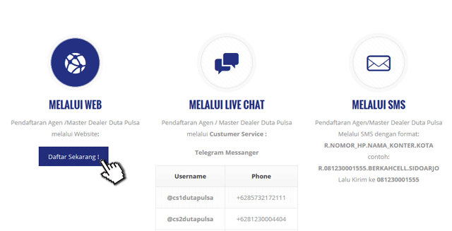 Ada beberapa pilihan metode pendaftaran, silahkan pilih sesuai dengan kebutuhan anda. Untuk keperluan pendaftaran silahkan klik Register Agen. Pada halaman tersebut ada 3 metode pendaftaran, dari ketiga metode tersebut sama-sama dibutuhkan scan/foto KTP yang berlaku. Inilah yang membuat perbedaan untuk menjadi agen Duta Pulsa. Keamanan menjadi prioritas utama, semua bertujuan menjaga keamanan dana dan terhindar dari segala bentuk pencucian uang, penipuan atau kejahatan lainnya.